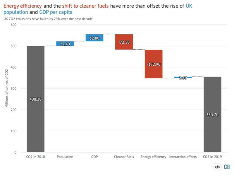 英國(guó)二氧化碳排放的下降主要靠能效的提高和低碳能源替代。與2010年(碳排放4.98億噸)相比,因?yàn)槿丝谠黾訉?dǎo)致碳排放增加2240萬(wàn)噸、經(jīng)濟(jì)增長(zhǎng)導(dǎo)致碳排放3280萬(wàn)噸,而低碳能源替代導(dǎo)致碳排放下降7250億噸,而能效的提高導(dǎo)致碳排放下降高達(dá)1.33億噸。