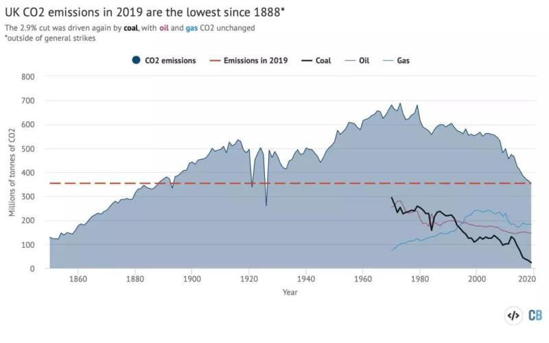 據(jù)英國(guó)CarbobBrief匯總的數(shù)據(jù),英國(guó)2019年的二氧化碳排放量約為3.54億噸,比上一年下降2.9%。這是英國(guó)的碳排放連續(xù)第七年下降,比1990年的水平低41%,意味著英國(guó)2019年的碳排放量降至1888年的水平。
