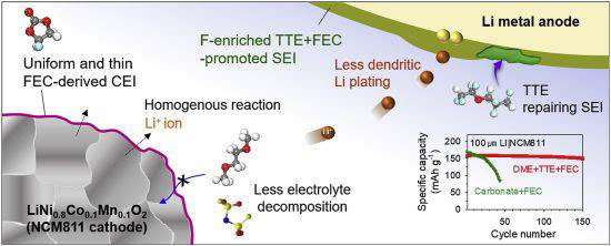 因此,改進的電解質(zhì)體系有望用于解決具有高鎳正極的高能量密度鋰金屬電池中不穩(wěn)定的醚基電解質(zhì)的還原和氧化分解問題。