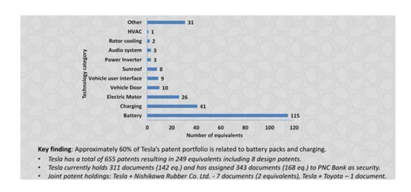 特斯拉專利的分布統(tǒng)計(jì),來源:Relecura