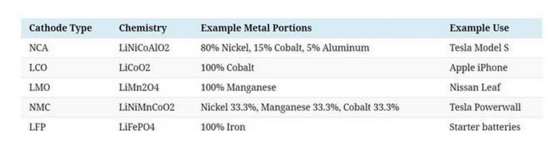幾種主要鋰離子電池,除鋰以外的金屬成分及用途,來源:Visual Capitalist