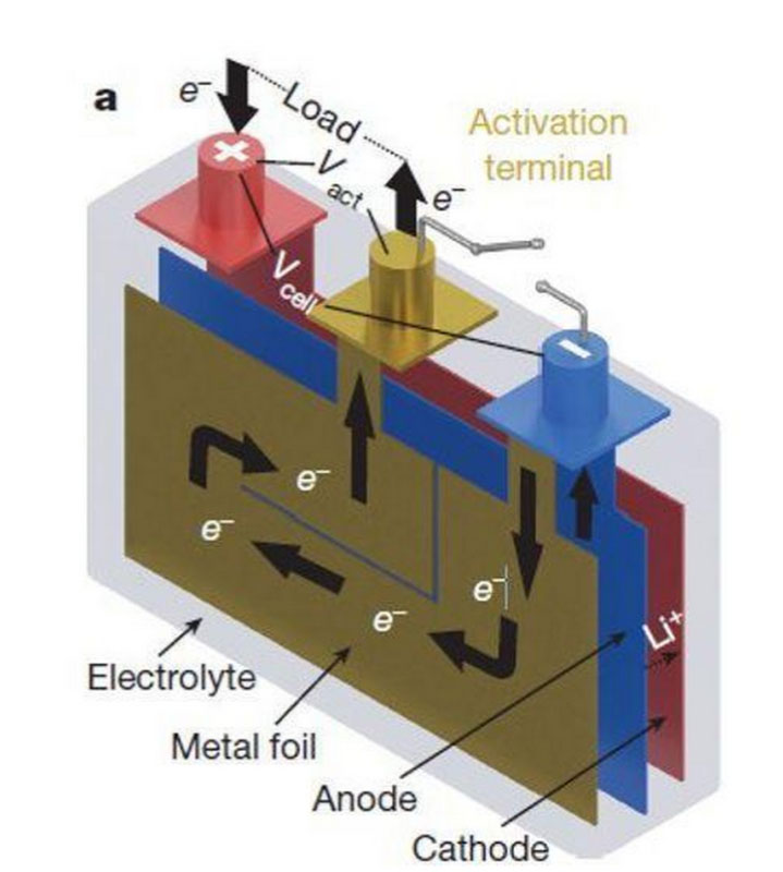這款新型鈍化電池的關鍵所在——“溫控開關”,源于王朝陽團隊在 2016 年發(fā)于《自然》期刊的全氣候電池發(fā)明。當時,為了解決電池在寒冷氣候和高海拔地區(qū)的功率銳減等使用問題,他們發(fā)明了一種插入到傳統(tǒng)電池結構中的金屬箔結構。該技術可以對電池進行均勻的內(nèi)部加熱,并為電極和電解質(zhì)提供快速熱傳遞;這個自熱功能是通過關閉激活端子和負極端子之間的開關來控制的。