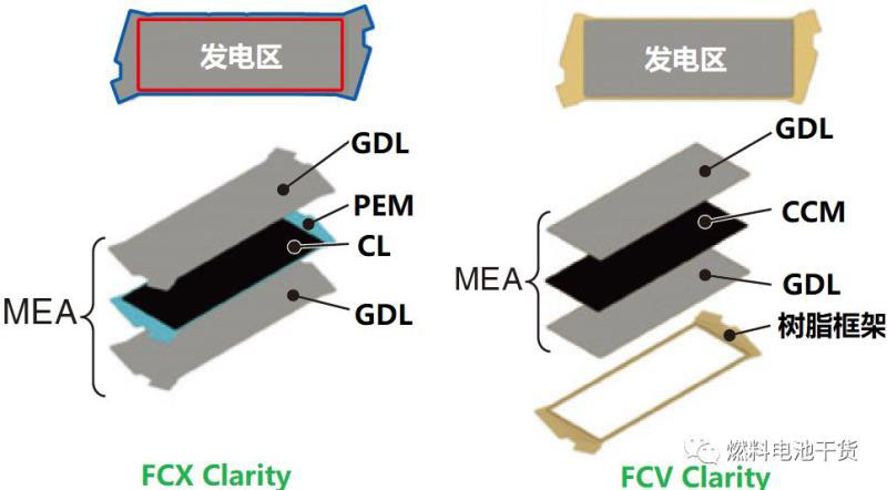 2016款FCV Clarity燃料電池對(duì)膜電極外圍的樹(shù)脂框架進(jìn)行重新設(shè)計(jì),并且與外圍樹(shù)脂框架接觸的極板保持平坦(無(wú)凹凸)。外圍樹(shù)脂框架部分設(shè)計(jì)出流槽,以給兩側(cè)分別導(dǎo)流氫氣和氧氣,保證電池表面氣體分布均勻。注意,F(xiàn)CX Clarity電池中,電極(催化層)為規(guī)則矩形狀,質(zhì)子膜和擴(kuò)散層為不規(guī)則形狀;FCV Clarity電池中,膜電極為規(guī)則矩形狀。