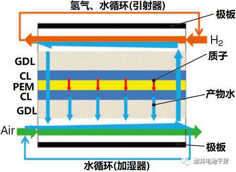 首先,F(xiàn)CV Clarity燃料電池陰陽(yáng)極進(jìn)氣方式從上一代垂直順流變成水平逆流。濕空氣在電池入口段向膜電極提供水分,產(chǎn)物水向電池陰極出口端移動(dòng),濕潤(rùn)出口端膜電極。緊接著,空氣出口段水分反擴(kuò)散至陽(yáng)極入口,陽(yáng)極入口水分沿流道方向傳質(zhì)擴(kuò)散,從而在膜電極內(nèi)形成水循環(huán)閉路,使膜電極水分均勻。