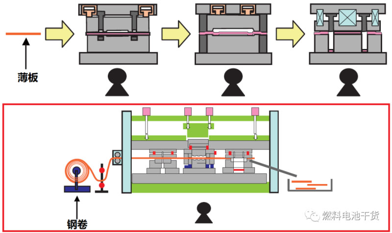 2004款FCX搭載燃料電池的CCM采用轉(zhuǎn)印法制備,即先將催化層制備在轉(zhuǎn)印膜(支撐層)上,通過(guò)熱壓法將催化層轉(zhuǎn)移到質(zhì)子膜兩側(cè),移除轉(zhuǎn)印膜即可獲得CCM。此外,2004款FCX金屬極板采用半自動(dòng)化方式連續(xù)沖壓?jiǎn)螛O板方法(2008款FCX Clarity采用高度自動(dòng)化的鋼卷漸進(jìn)式?jīng)_壓)。