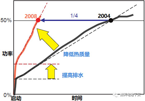 2008款FCX Clarity燃料電池電池主要通過(guò)垂直進(jìn)氣結(jié)構(gòu)提升排水能力和降低40%熱質(zhì)量來(lái)提高低溫啟動(dòng)性能。2016款FCV Clarity則主要通過(guò)降低熱質(zhì)量、減少膜電極組件面積電阻來(lái)提升溫升。質(zhì)子膜變薄、提高質(zhì)子膜電導(dǎo)率、擴(kuò)散層變薄等措施進(jìn)一步降低膜電極組件的面積電阻。通過(guò)保持膜電極表面水分均勻進(jìn)一步減少低濕環(huán)境下的質(zhì)子膜電阻(逆流實(shí)現(xiàn))。上述措施使電堆在-20℃環(huán)境下的電阻降低1/3,提高了啟動(dòng)性能。降低流道槽深和電池片數(shù)實(shí)現(xiàn)體積更小重量更輕,電池內(nèi)冷卻液的體積也減少,這些使得電堆熱質(zhì)量降低12%,提高了啟動(dòng)過(guò)程功率增加速度(相比上一代電堆,-20℃環(huán)境下自啟動(dòng)至50%功率耗時(shí)降低一半)。