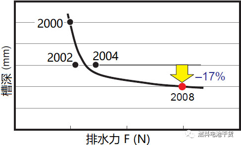 2004款FCX搭載電堆氣體進(jìn)出口壓差是流道中水排出的唯一驅(qū)動(dòng)力。2008款FCX Clarity中通過(guò)在進(jìn)出口壓差中增加了重力項(xiàng),提高了排水能力,使得氣體流道降低的同時(shí)發(fā)電性能能夠穩(wěn)定維持。和2004款FCX電堆相比,2008款FCX Clarity電堆氣體流道不僅降低17%,而且排水能力有所上升。
