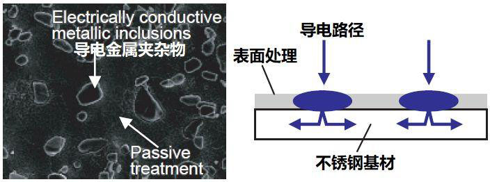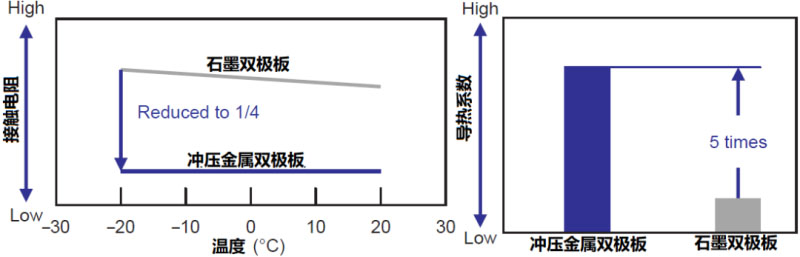 本田汽車公司2004款FCX燃料電池堆最大變化在于金屬極板取代了石墨板(相比2002款FCX)。本田汽車公司開(kāi)發(fā)了一種含導(dǎo)電涂層的不銹鋼板,利用不銹鋼的高導(dǎo)熱性和導(dǎo)電性,使得-20℃環(huán)境下不銹鋼極板接觸電阻僅為石墨極板接觸電阻1/4。高強(qiáng)度不銹鋼使得雙極板厚度做到石墨板的一半,有效提升功率密度。此外,不銹鋼極板導(dǎo)熱系數(shù)比石墨板高出約5倍,強(qiáng)化了整堆的升溫能力。最后,為有效提升導(dǎo)電性和耐腐性能,不銹鋼極板表面涂層中添加導(dǎo)電粒子(導(dǎo)電金屬夾雜物)。