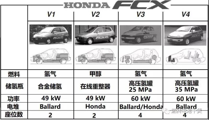 本田汽車公司自1999年正式推出搭載巴拉德電堆的燃料電池原型車FCX-V1以來(lái),一直堅(jiān)持自主研發(fā)燃料電池系統(tǒng)。第一輛原型車FCX-V1于1999年正式推出,采用了巴拉德公司功率60 kW的石墨極板燃料電池堆,系統(tǒng)輸出功率49 kW。此外,1999年也首次為測(cè)試原型車FCV-V2配備了本田自制以在線重整甲醇為氣源的質(zhì)子交換膜燃料電池堆,系統(tǒng)輸出功率49 kW(60 kW電堆)。2000年,本田分別推出搭載巴拉德公司和本田自制石墨燃料電池堆的兩款原型車FCX-V3。
