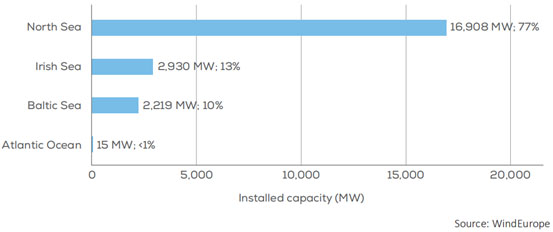 2019年,超過(guò)99%的新增并網(wǎng)裝機(jī)在北海。只有Windfloat Atlantic浮式風(fēng)電場(chǎng)位于大西洋,1臺(tái)風(fēng)電機(jī)組并網(wǎng)。