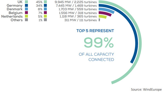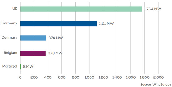 2019年,歐洲海上風(fēng)電并網(wǎng)容量?jī)粼鲩L(zhǎng)3,623MW,創(chuàng)下了年度增長(zhǎng)最高記錄;2019年新增裝機(jī)容量總計(jì)3,627MW。新增裝機(jī)容量中,英國(guó)1,764 MW,德國(guó)1,111MW,丹麥374 MW,比利時(shí)370 MW,葡萄牙8 MW。