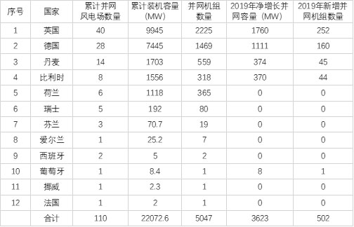 截止2019年底歐洲海上風(fēng)電并網(wǎng)情況一覽表