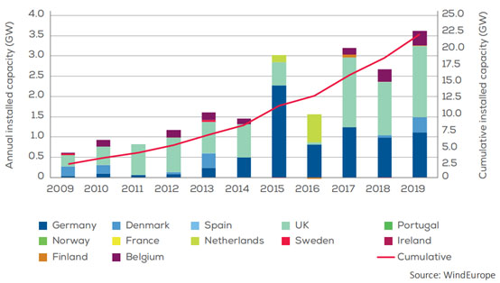 2019年,英國(guó)、丹麥和比利時(shí)創(chuàng)下了本國(guó)年度最高裝機(jī)記錄。荷蘭2019年沒(méi)有新增并網(wǎng)機(jī)組,但已經(jīng)開(kāi)始Borssele 3&4風(fēng)電場(chǎng)的單樁基礎(chǔ)安裝,預(yù)計(jì)2020年投入運(yùn)行。西班牙在位于加那利群島的PLOCAN試驗(yàn)基地測(cè)試了第一臺(tái)多機(jī)組漂浮式平臺(tái)。英國(guó)布萊斯(Blyth)試驗(yàn)基地的2臺(tái)風(fēng)電機(jī)組(2 MW/臺(tái))退役。