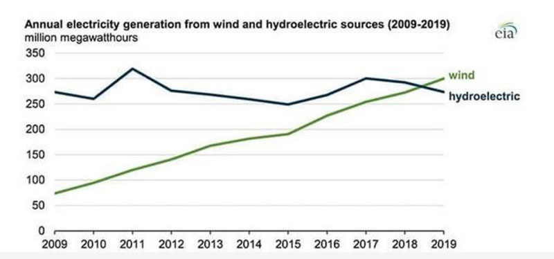 根據(jù)美國(guó)能源信息署(EIA)26日發(fā)布的數(shù)據(jù),年風(fēng)力發(fā)電量在2019年首次超過(guò)水力發(fā)電,成為該國(guó)生產(chǎn)量最大的可再生能源。