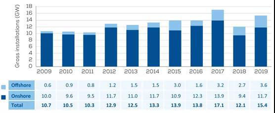 2019年,歐洲風(fēng)電新增裝機(jī)容量15.4GW,比2018年增長(zhǎng)27%,但比裝機(jī)最高年份的2017年下降了10%。