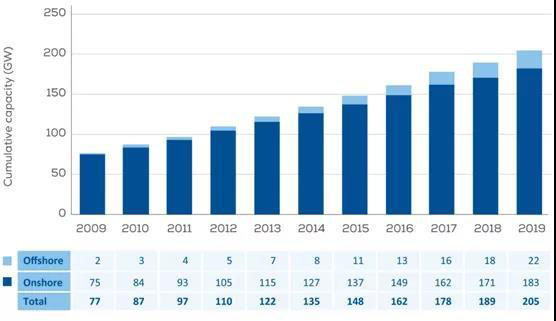 截止2019年底,歐洲風(fēng)電累計(jì)裝機(jī)容量205GW。風(fēng)力發(fā)電電量占到了歐盟28個(gè)成員國(guó)當(dāng)年電力消耗的15%。
