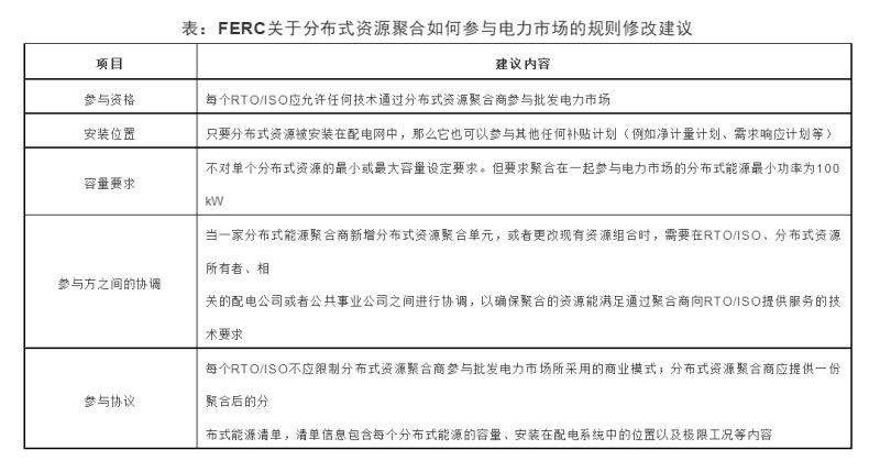 2016 年, 加利福尼亞獨立系統(tǒng)運營商(CAISO)、賓州-新澤西-馬里蘭州際聯(lián)合電力系統(tǒng)運營商(PJM)、紐約獨立系統(tǒng)運營商MYISO紛紛向FERC提出建議,申請修改其市場規(guī)則,推動分布式能源聚合參與電力市場交易。為了響應(yīng)這些提案,2016 年11 月,F(xiàn)ERC發(fā)布了市場規(guī)則修改建議公告,針對如何消除電儲能和分布式能源聚合參與批發(fā)電力的障礙提出建議。公告首先明確了電儲能的定義,即“電儲能指存儲來自電網(wǎng)的電力、稍后再送電給電網(wǎng)的各種儲能技術(shù),包含電池、飛輪、壓縮空氣儲能、抽水蓄能等,且該定義與容量大小無關(guān),與其在電力系統(tǒng)中的安裝位置也無關(guān)?!贬槍Ψ植际侥茉淳酆希現(xiàn)ERC 提出要求每個RTO/ISO 都明確分布式能源聚合商的定義,并將其作為一類市場參與者,能夠在現(xiàn)有的模式下參與到批發(fā)電力市場中。公告還從分布式能源聚合參與電力市場的資格、安裝位置、容量要求、參與方之間的協(xié)調(diào)、協(xié)議等方面提出的建議,見下表。