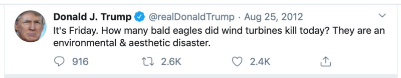 特朗普總統(tǒng)討厭風(fēng)力發(fā)電已經(jīng)不是秘密了,早在2012年他就在推特上說(shuō)風(fēng)電是一場(chǎng)“環(huán)境和審美災(zāi)難”,并指責(zé)風(fēng)機(jī)屠殺鳥(niǎo)類。據(jù)報(bào)道,特朗普對(duì)風(fēng)電的敵意源于他擔(dān)心海上風(fēng)電場(chǎng)會(huì)損害他在蘇格蘭的一個(gè)高爾夫球場(chǎng)的景觀。