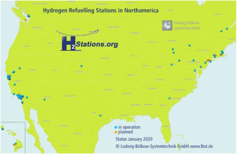 北美地區(qū)方面,H2stations數(shù)據(jù)顯示,截止2019年底加氫站數(shù)量達(dá)到74個(gè),其中大多數(shù)仍位于加州(48個(gè))。2019年北美地區(qū)增加了四個(gè)新的加氫站,在未來(lái)還將新建立21個(gè)新的加氫站。