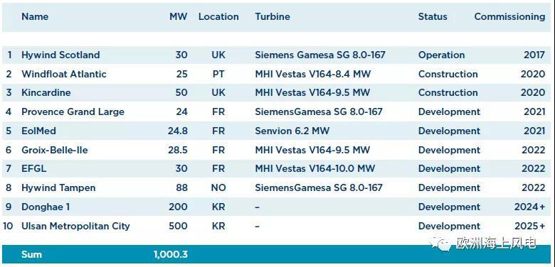在建項(xiàng)目(未全部投運(yùn),至少安裝了一臺(tái)風(fēng)機(jī))2個(gè):葡萄牙Windfloat Atlantic,25MW;英國(guó)Kincardine,50MW。