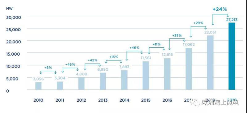 截至2019年底,全球海上風(fēng)電累計(jì)裝機(jī)容量27.2GW,比2018年底的數(shù)字增長(zhǎng)了24%。