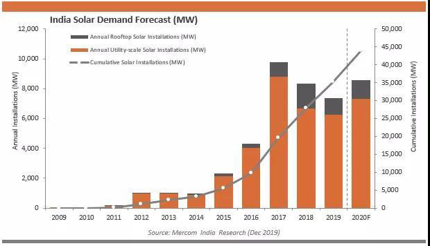 盡管對(duì)于印度的太陽能行業(yè)而言,2019年是虧損的一年,但Mercom 資本印度子公司預(yù)計(jì),到2020年底,太陽能安裝量將同比增長17%,達(dá)到約8.5 GW,盡管如此要實(shí)現(xiàn)到2022年100吉瓦的目標(biāo)仍然存在很大不確定性。