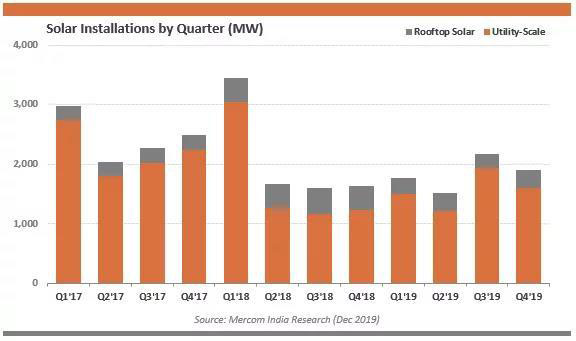 根據(jù)Mercom資本印度子公司統(tǒng)計(jì)數(shù)據(jù)顯示,2019年印度新增太陽能裝機(jī)容量7.3吉瓦,同比下降12%,這讓其原本就讓人擔(dān)憂無法實(shí)現(xiàn)的100吉瓦太陽能安裝目標(biāo)變得更加艱難。