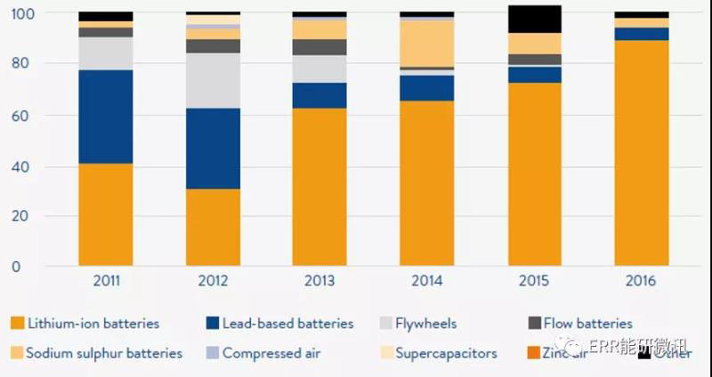 2011~2016年儲能規(guī)模結構,按技術劃分(不含抽水蓄能)