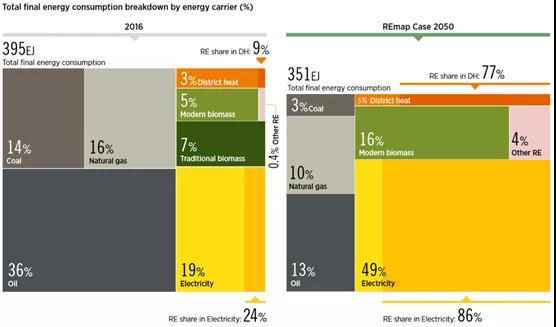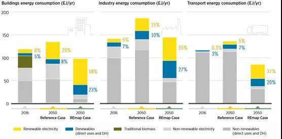 圖1 到2050年,電力將成為主要能源,同時(shí)總能耗將減少,可再生能源占比增加