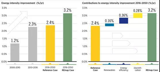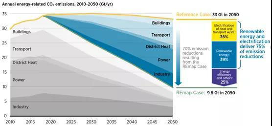加快可再生能源的部署,結(jié)合深層電氣化和提高能源效率是實(shí)現(xiàn)低碳可持續(xù)發(fā)展的重要手段。2050年可實(shí)現(xiàn)90%的碳減排量,其中僅可再生能源、供熱和運(yùn)輸電氣化就可減少排放的75%。報(bào)告分析了碳減排的兩種路徑,即各國正在實(shí)施或計(jì)劃實(shí)施的碳排放政策路徑(參考路徑)和基于可再生能源技術(shù)以及提高能源效率的低碳技術(shù)路徑(RE路徑),相比參考路徑,RE路徑下的碳排放可進(jìn)一步減少總量的70%(見圖2)。