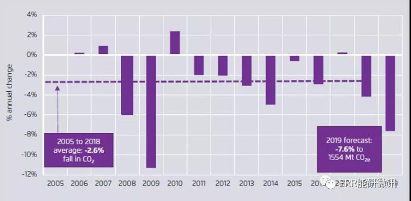 2.煤炭(消費(fèi))的下降意味著2019年歐洲電力部門的二氧化碳排放量下降了創(chuàng)紀(jì)錄的1.2億噸(12%),這可能是有史以來最大的降幅。2019年歐盟排放交易體系(EU ETS)中固定排放(包括重工業(yè))同比下降7.6%,這意味著工業(yè)排放可能僅減少1%。然而,歐盟排放交易體系涵蓋的總排放量下降的速度比限值要快得多;顯示進(jìn)一步加強(qiáng)歐盟排放交易體系在加速歐洲氣候行動方面所發(fā)揮的核心作用。