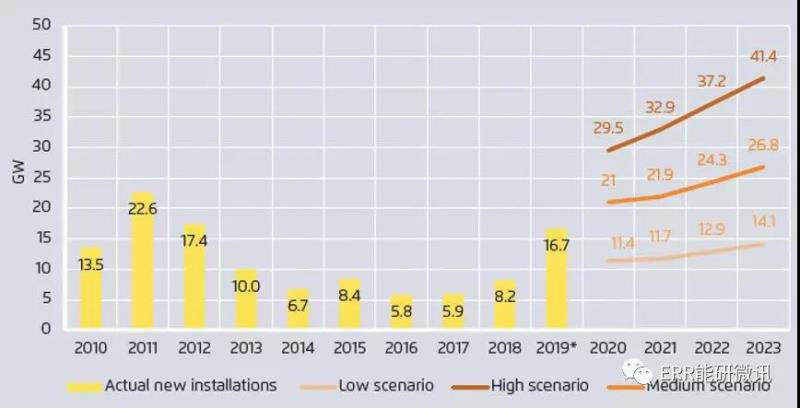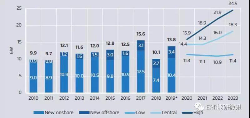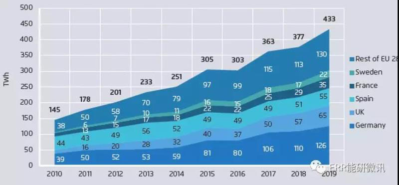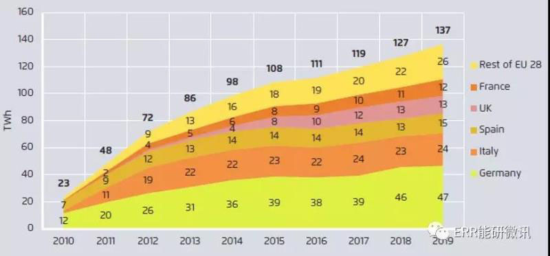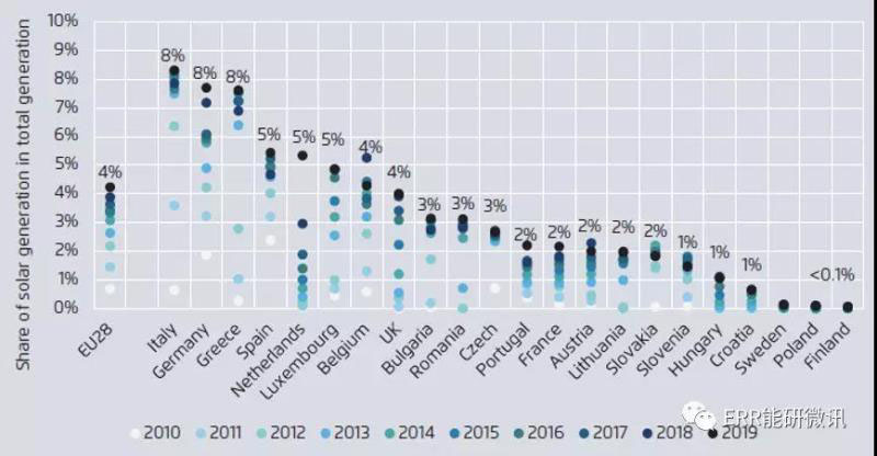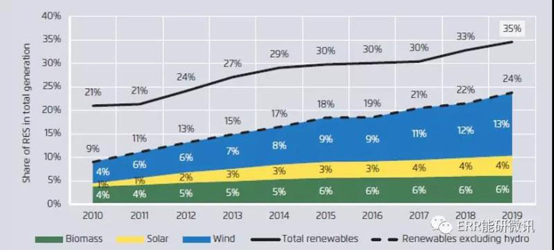 3.可再生能源發(fā)電量占?xì)W盟總發(fā)電量的35%,創(chuàng)歷史新高。風(fēng)能和太陽能的發(fā)電量首次超過煤電,2019年占?xì)W盟總發(fā)電量的18%。自2013年以來,可再生能源市場份額翻了一倍以上。西歐的風(fēng)能和太陽能發(fā)電增長最為強(qiáng)勁,波蘭和希臘為新晉市場。東歐其他地區(qū)明顯落后。低成本可再生能源的經(jīng)濟(jì)機(jī)會日益明顯。2019年,海上風(fēng)電(英國)和太陽能(葡萄牙)的拍賣價格創(chuàng)下歷史新低,低于批發(fā)價,而在風(fēng)能和太陽能規(guī)模擴(kuò)展最大的國家,最大批發(fā)價格也有所下降。