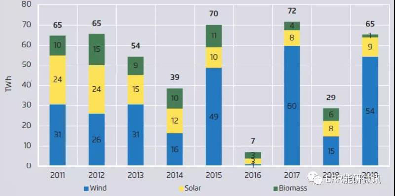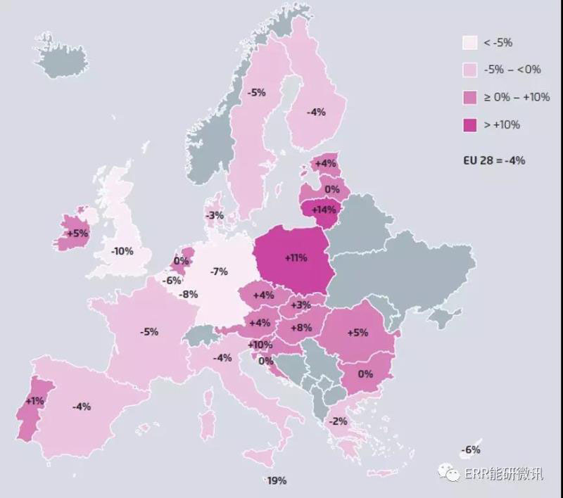 歐盟28國風(fēng)能、太陽能和生物質(zhì)發(fā)電量同比變化