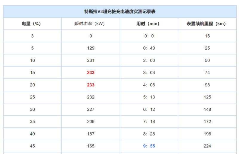 如果單從性能數(shù)字上看,特斯拉V3擁有250kW的峰值充電功率,相比V2的120kW峰值充電功率要翻上一番,那么我們或許會(huì)下意識(shí)的認(rèn)為V3超充的充電速度會(huì)比V2快上一倍。然而,經(jīng)過(guò)實(shí)際測(cè)試,我們發(fā)現(xiàn)事實(shí)并非如此,因?yàn)楫吘狗逯党潆姽β什⒉粫?huì)一直保持,當(dāng)充電到達(dá)55%以后,V3超充與V2超充的差距將不再明顯。