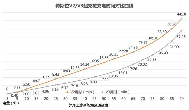 回答文初的問(wèn)題,V3超充到底有多快?如果是在55%以下這個(gè)對(duì)V3比較理想的充電區(qū)間來(lái)看,V3超充的速度要大幅領(lǐng)先于V2,我們實(shí)測(cè)從3%-55%(對(duì)應(yīng)表顯續(xù)航里程從16km到272km)充電時(shí)間為13分06秒,而V2需要20分35秒,充電時(shí)間提升了約36%。而如果放大到3%-90%充電區(qū)間,則充電速度提升了約16%。以此來(lái)看,V3超充樁的確比V2超充樁充電速度更快,但并不像兩個(gè)充電樁峰值充電功率的差距那樣明顯,這一點(diǎn)需要大家清楚。
