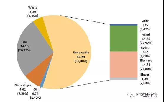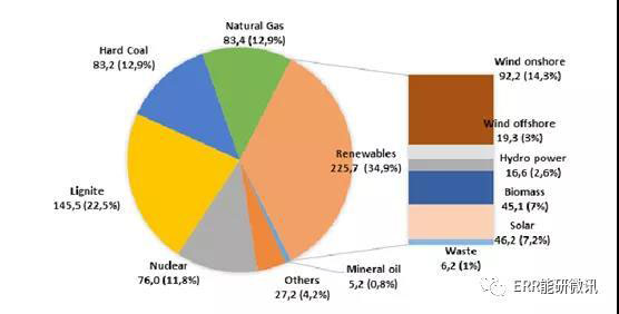 圖4 2018年德國總發(fā)電量中各能源占比 單位:TWh