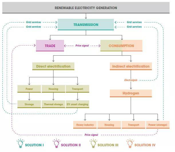 —通過氫氣間接電氣化,使用可再生能源生產(chǎn)、儲存或供應用于運輸、住房和工業(yè)應用。請參閱解決方案Ⅳ。