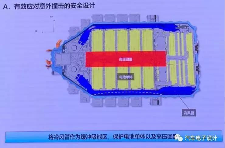 在下圖中,我們可看到如此大的這個電池外部圍了一圈冷風(fēng)管,可能是作為緩沖吸能區(qū)來保護(hù)電池和高壓回路,前面一部分則是風(fēng)機(jī)。