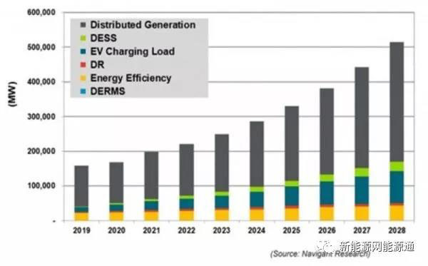 該報告預測,2019年分布式能源容量將達到158.3GW,到2028年將達到近345GW。其中,約245GW來自太陽能光伏裝置,而93GW來自電動汽車充電站。