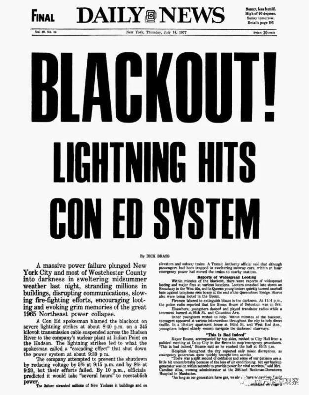 當(dāng)年的報(bào)紙標(biāo)題《大停電!閃電擊中聯(lián)合愛迪生供電系統(tǒng)》
