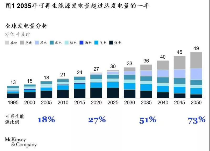 隨著行業(yè)供應(yīng)鏈日趨成熟,儲能成本大幅下降,早期對可再生能源發(fā)展高成本及電力供應(yīng)不穩(wěn)定等的擔(dān)憂逐步平息。以北美地區(qū)為例,從2012到2018年,陸上風(fēng)電發(fā)電成本由0.072美元/千瓦時降至今日的0.042美元/千瓦時;電池成本也從2013年的650美元/千瓦時下降到了2018年的176美元/千瓦時。麥肯錫預(yù)測,未來可再生能源需求有望大幅提升,發(fā)電量占比將從今日的25%飛速提升至2035年的51% (見圖1)。