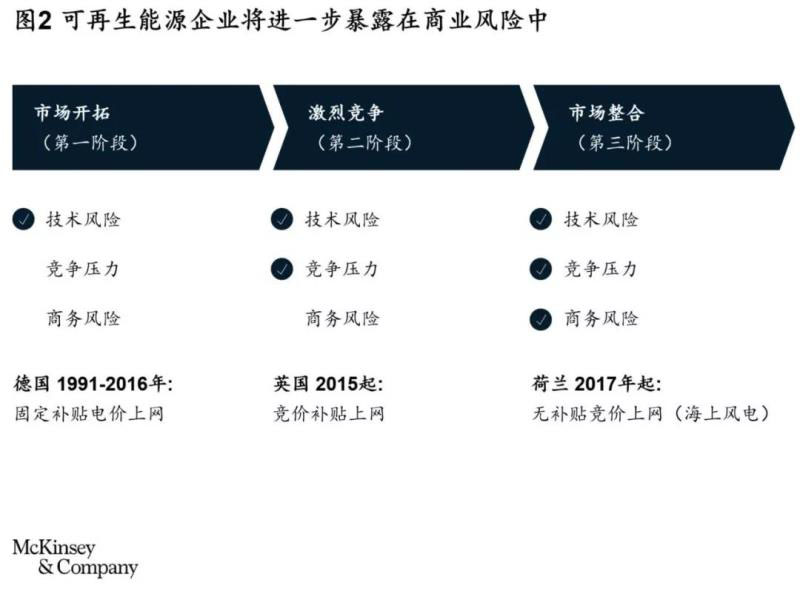 市場環(huán)境也日趨復(fù)雜。電網(wǎng)的要求日益增高,可再生能源公司需承擔(dān)起平衡電網(wǎng)系統(tǒng)的責(zé)任,如按需峰谷減產(chǎn),增加站點(diǎn)儲能能力等。除此之外,可再生能源補(bǔ)貼政策和購電協(xié)議(PPA)的收入份額下降,項(xiàng)目商業(yè)條款更加嚴(yán)格等,也會讓可再生能源公司面臨更多潛在風(fēng)險(xiǎn)(見圖2)。在這個快速發(fā)展的行業(yè)中,什么才是成功的關(guān)鍵,什么樣的玩家才能獲勝呢?