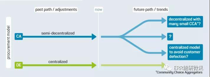 可再生能源采購。兩個地區(qū)很好的過渡了可再生能源作為外來技術(shù)的時期,現(xiàn)在面臨著將大規(guī)??稍偕茉吹碾娏ο到y(tǒng)融合。分配問題,例如我們在哪里建廠以及如何分配政策成本,變得更加重要。德國依靠集中采購模式。在加利福尼亞的分散管理方法中,不受監(jiān)管的社區(qū)選擇匯總器的出現(xiàn)逐漸地導致客戶流失。接下來,加州面臨著一個選擇:要么嘗試調(diào)整其可再生能源政策,以適應(yīng)分散的電力市場環(huán)境,要么通過一個更加集中的機制集中其采購決策,這種機制再次從個體零售供應(yīng)商手中奪走了自由裁量權(quán)。趨勢概述見圖ES-3,具體說明詳見第4.2節(jié)。