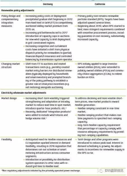 在第3節(jié),我們在此背景下考慮如何設(shè)計和改革市場和政策,以適應(yīng)可再生能源在電力系統(tǒng)中所占份額的增長。如上所述,我們注意到德國,在成本并不特別令人擔憂的長期"來試試"階段之后,隨著可再生能源發(fā)電達到較高水平,市場和政策設(shè)計方面進行了實質(zhì)性改革,以提高政策的成本效益,使市場更高效3。與此相反,加州的市場政策變化更為漸進,且不一定是因為可再生能源增加驅(qū)動。至少在最近,德國的政策演變可能被看作是通過法律和監(jiān)管改革發(fā)展起來的一種更為謹慎的能源轉(zhuǎn)變,而在加州,這一過程是由實驗推動的。這兩個地區(qū)都經(jīng)歷了能源成本的上漲,這引發(fā)了對推廣可再生能源的激進政策的一些反對,而且都開始擔心剛性管理的缺陷,這些缺陷有時會為可再生能源投資提供低效或不公平的激勵。表ES-1概述了電力部門的重要發(fā)展和最新趨勢以適應(yīng)可再生能源。