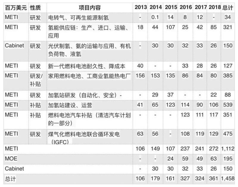 根據日本能源研究所(IEEJ)在IEEG Energy Journal雜志2019年第3期發(fā)表的文章,2013-2018年間日本政府為氫能的研發(fā)的投入、氫能應用的補貼金額逐年上升,總計為14.58億美元,具體情況如下表所示: