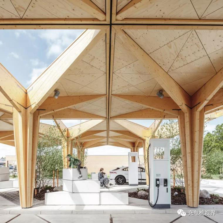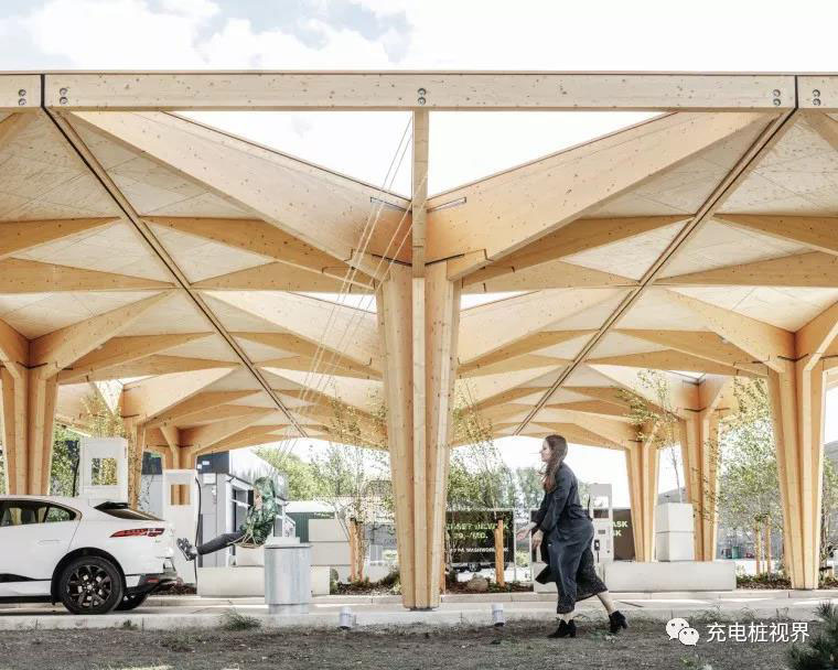 充電站由一排排“樹(shù)木”組成,樹(shù)下有一個(gè)遮陽(yáng)篷,可以濾光遮陰。COBE的建筑師兼創(chuàng)始人丹·斯塔伯加德評(píng)論道:“我們?cè)O(shè)計(jì)的這個(gè)充電站,使用可持續(xù)材料,放置在一個(gè)干凈、平靜的環(huán)境中,周?chē)袠?shù)木和植物,讓人們?cè)诟咚俟飞媳3謱?zhuān)注。”