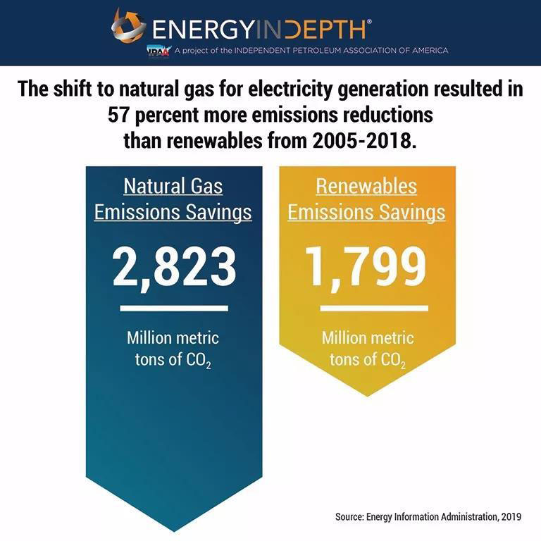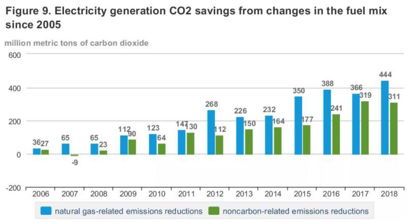 根據(jù)美國(guó)能源信息署(EIA)的統(tǒng)計(jì)數(shù)據(jù),在2005年至2018年之間,美國(guó)二氧化碳累計(jì)減少量總計(jì)為46.21億噸,具體歸因于從煤炭向天然氣和可再生能源發(fā)電的轉(zhuǎn)型。其中,天然氣替代煤電減排量28.23億噸,可再生能源發(fā)電減排17.99億噸。2018年天然氣發(fā)電減排量4.44億噸,可再生能源發(fā)電減排3.11億噸。