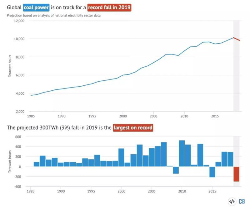 根據(jù)CarbonBrief發(fā)表報(bào)告,基于2019年前10個(gè)月來自世界各國的每月電力部門數(shù)據(jù),全球煤炭發(fā)電量有望在2019年下降3%左右(將減少約300太瓦時(shí),TWh),超過去年德國、西班牙和英國的煤電總產(chǎn)量,創(chuàng)歷史上最高跌幅。