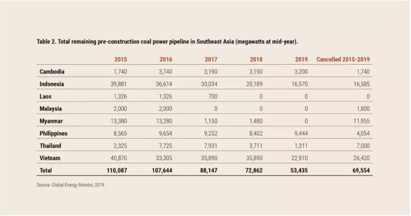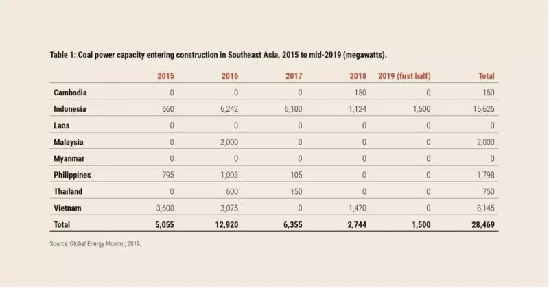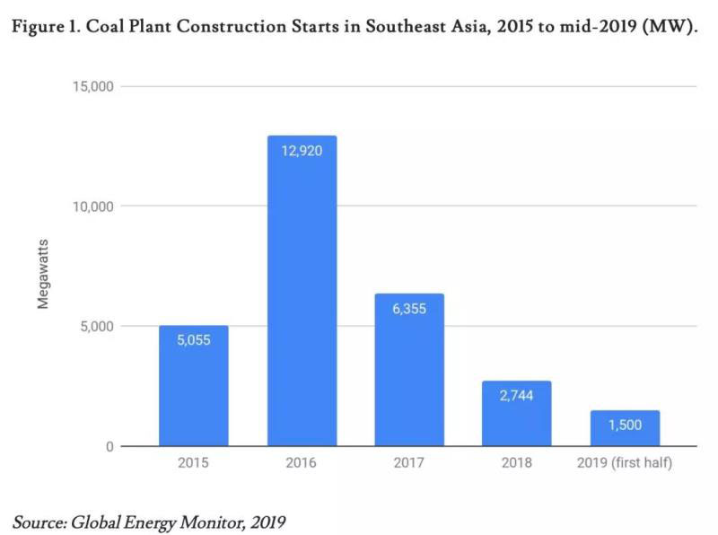 全球能源監(jiān)測(cè)(Global Energy Monitor)的最新數(shù)據(jù)顯示,東南亞煤電廠開(kāi)工自2016年達(dá)到12,920兆瓦的峰值后,開(kāi)工量急劇下降。2017年有6,355兆瓦開(kāi)工,2018年只有2,744兆瓦開(kāi)工,2019年前6個(gè)月有1,500兆瓦煤電裝機(jī)開(kāi)工建設(shè)(印度尼西亞)。