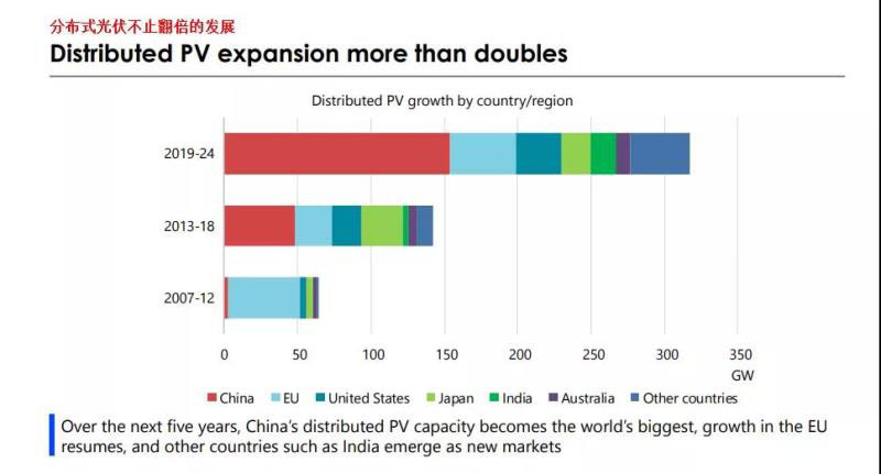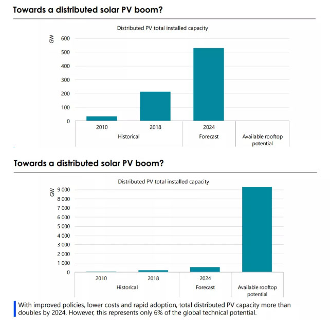 在經(jīng)濟狀況改善、完善的政策支持、有效的監(jiān)管等各個有利條件下,到2024年,分布式光伏的全球裝機容量可超過600吉瓦,幾乎是日本總電力裝機的兩倍。而這還僅僅是分布式光伏技術(shù)潛力的6%(基于可用屋頂總面積)。